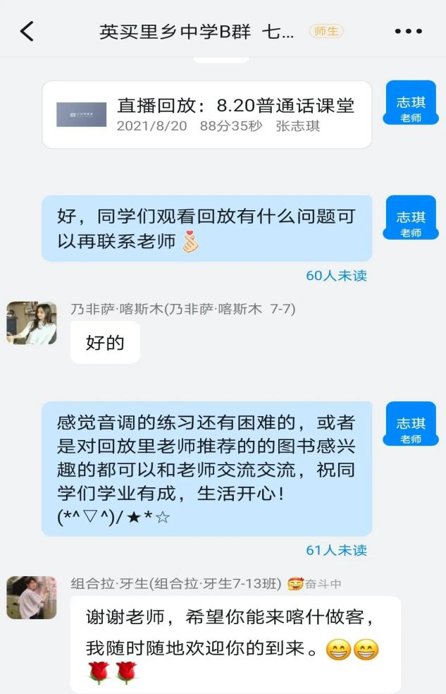 为深入贯彻全国语言文字会议精神,国学经典“邮递员”团队,在线上展开“鲁新共语中国话,聊喀齐筑民族情”专项社会实践活动。8月17日至21日,团队开展普通话课堂,在孙哲和冯静两位指导老师带领下,实践队员韩丽、苏比旦、张志琪等担任授课教师,面向新疆伽师县英买里乡中学90名教师,七年级、八年级120名学生展开教学。
