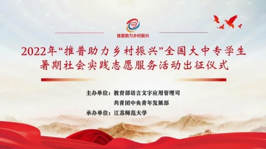 7月18日,由教育部语言文字应用管理司、共青团中央青年发展部共同主办的2022年“推普助力乡村振兴”全国大学生暑期社会实践志愿服务活动出征仪式暨实践培训在江苏师范大学举行,江苏师范大学党委书记华桂宏致辞,志愿者代表、教师代表发言,团中央青年发展部实践教育处处长阚宝奎、教育部语言文字应用管理司副司长王晖讲话。英国365集团公司国学经典“邮递员”志愿服务队指导教师石勇受邀线上参加出征仪式。