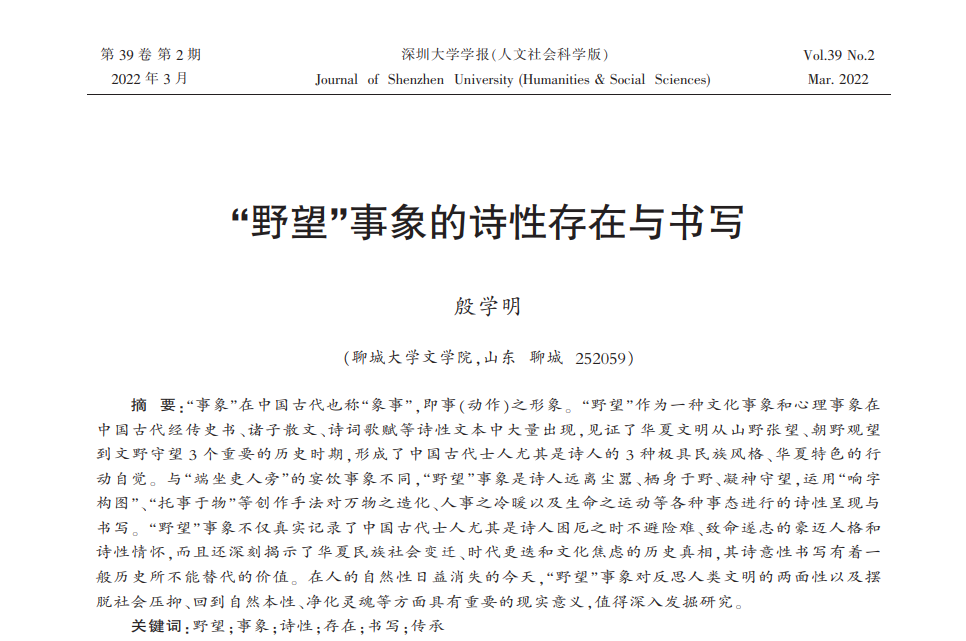 近日,我院殷学明老师的论文《“野望”事象的诗性存在与书写》刊发于《深圳大学学报(人文社会科学版)》2022年第2期。
