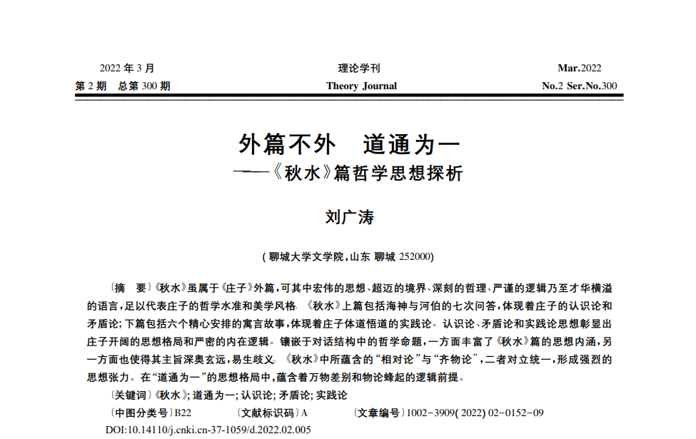 近日,我院刘广涛老师的论文《外篇不外 道通为一——<秋水>篇哲学思想探析》刊发于《理论学刊》2022年第2期。