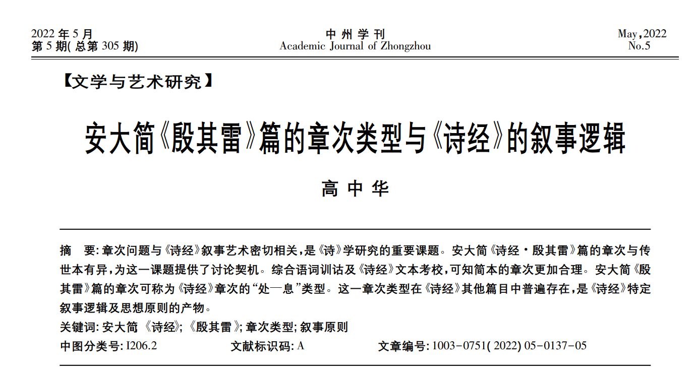 近日,我院高中华老师的论文《安大简<殷其雷>篇的章次类型与<诗经>的叙事逻辑》刊发于《中州学刊》2022年第5期。