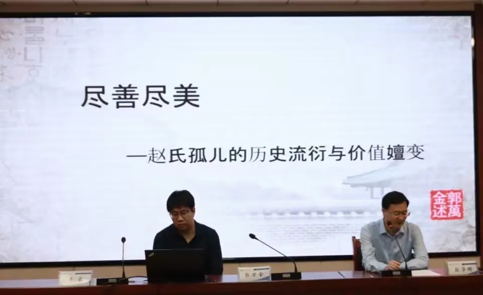 郭万金教授从价值与价值观、文学使命与价值实现、特殊的例证视角三个方面引出问题。他提出价值理解的三个方面:交换、必须付诸行动才能实现、价值实现的人文生态必须予以全面关注,如此才能理解价值的全部内涵。其中包括孔子的价值观、王国维的三大境界、中华民族的价值传统等相关例子。随后,郭教授阐释了赵氏孤儿的文化特例,即一脉相承、兼涉四部、雅俗共赏,通过讲解《史记·赵世家》中的片段,引出全副故事的核心精神为不惜一切地保存。最后,郭万金教授以《红楼梦》一书作为参照。他认为,《红楼梦》是不惜一切的价值毁灭,而《赵氏孤儿》是不惜一切的价值保存。报告结束后,郭万金教授耐心回答了在场学生的提问。殷学明高度肯定本次报告会的学术价值,从进阶、常识、真理三层次深刻表达感受。他表示,郭教授的报告由浅入深,鞭辟入里,值得我们每个人潜心学习。