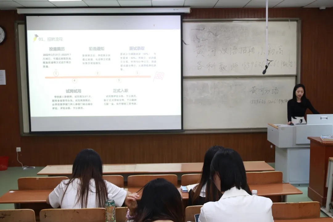 本次招聘宣讲会分两场同时进行,济南黄河双语实验学校与菏泽郓城双城双语实验学校主讲老师首先通过播放招聘宣传片向大家展示各自学校优美的环境、雄厚的师资力量及良好的氛围。接着,主讲老师通过PPT向大家讲解各自学校的地理位置、办学历史及教师薪资、福利待遇等问题。济南黄河双语实验学校主讲老师提到,学校为老师提供了广阔的发展平台,定期进行教师培训活动,同时,老师可以通过职称聘任、争做核心骨干教师等方式来进行职业晋升。菏泽郓城双城双语实验学校主讲老师也通过PPT向大家讲解了学校的地理位置及教师福利待遇等问题。在答疑环节,同学们与主讲老师积极互动交流,主讲老师们详细解答了疫情期间线上面试及教师实习期间薪资等问题。最后,同学们添加招聘负责人微信,本次招聘宣讲会圆满结束。