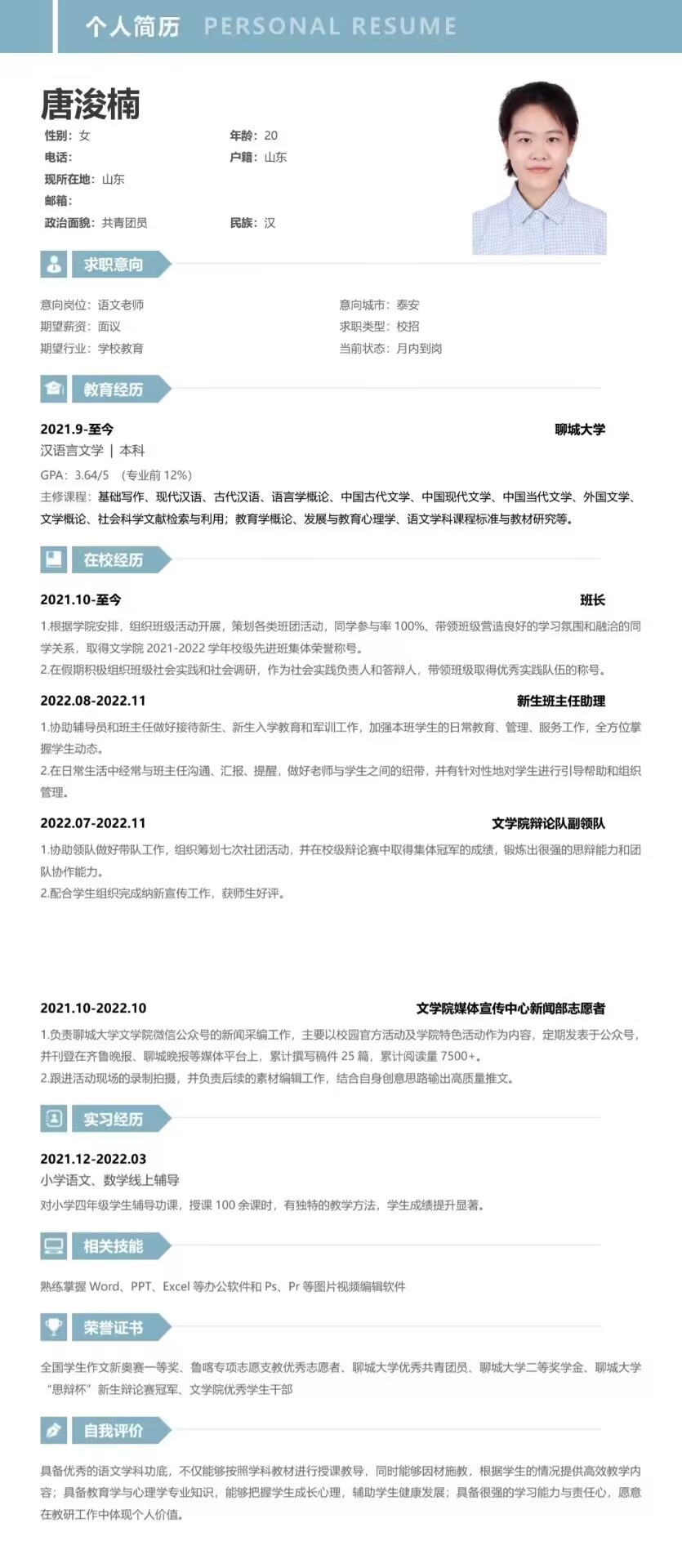 擘画宏图奏新乐,笃行不怠展未来。优秀的简历是求职应聘路上一块重要的“敲门砖”,是获得面试资格的关键所在。参赛学生结合自身优势,在简历中展示自身独特风采。胡曼玉围绕自身素质与工作经验进行自我评价,她的简历内容条理清晰、构思新颖,特有的创新实践经历与求职岗位高度匹配,丰富的学习经验、实习经历既表现出她优秀的专业能力,又传达出务实的职业态度。刘保汝的简历中求职目标明确,内容充盈完善,优异的自身素质、专业技能鲜明表现出她的核心竞争力,在展示设计与排版能力的同时,又明确表达自身职业规划。杨宁从版面设计上另辟蹊径,她的简历设计美观大方,让人耳目一新,简明扼要地展现出教育经历、个人荣誉,自荐信中态度温和谦逊,传达出锐意进取、自信昂扬的精神风貌,每一处细节都体现出她对职场的憧憬与热爱,极具感染力。“简”而不凡,“职”击梦想。同学们制作的简历各有千秋,呈现出自身独有优势,描绘出职业蓝图。活动中学生更加明确自身职业规划,促进职场应聘能力的提高,真正实现以赛促学、以赛促业。